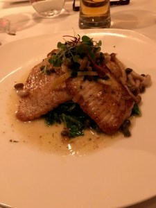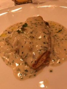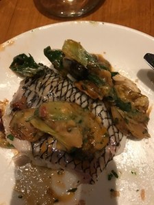 I started with an appetizer of the Warm Lump Crabmeat and Mushroom Crepe, Fresh Herbs Beurre Blanc, White Truffle Oil which was awesome.The next course was an Atlantic Skate Wing,Braised Kale, Preserved Lemon, Honshimeji, Basil, Caper Brown Butter Sauce. I usually cook this myself all the time because it is such an easy dish :). Whenever I get the chance to get the skate I do and this dish did not disappoint. A very nice creme brule completed the evenings meal. Really unusual touch when one of our crew had a doggy bag (not me -nothing left on my plates!) they gave you a number ticket to pick up at the door when he left rather than at the table.