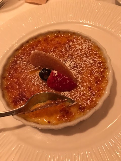 I started with an appetizer of the Warm Lump Crabmeat and Mushroom Crepe, Fresh Herbs Beurre Blanc, White Truffle Oil which was awesome.The next course was an Atlantic Skate Wing,Braised Kale, Preserved Lemon, Honshimeji, Basil, Caper Brown Butter Sauce. I usually cook this myself all the time because it is such an easy dish :). Whenever I get the chance to get the skate I do and this dish did not disappoint. A very nice creme brule completed the evenings meal. Really unusual touch when one of our crew had a doggy bag (not me -nothing left on my plates!) they gave you a number ticket to pick up at the door when he left rather than at the table.