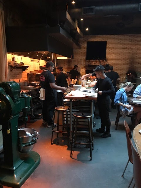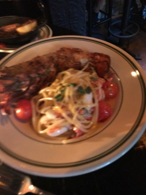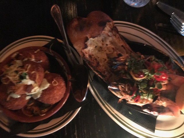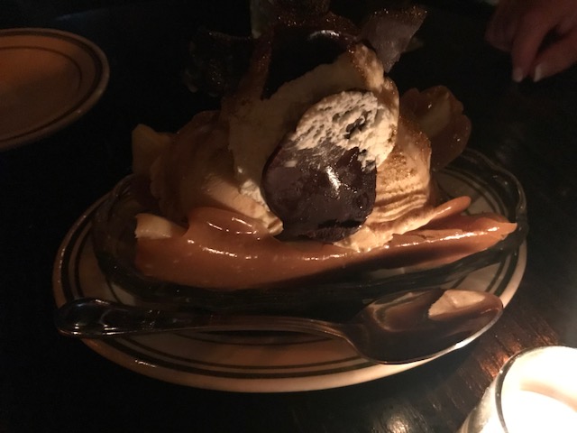 Last weekend we got the opportunity to go to Antique Bar and Bakery in Hoboken which we had heard great things about. The restaurant did not disappoint and the vibe was very cool with great music and a kitchen that is open and near our table; a little dark but the pictures came out ok. Careful because the drinks are kind of pricey but the appetizers were very good. We shared the rice balls and peas as well as the Hot Oil Shrimp. For our main courses, Connor had the Hanger steak with an excellent dipping sauce, Leslie got the Black Bass and my stuffed lobster with pasta was really good.The most unusual part of the meal was the Peanut butter and Bacon banana split. I am not sure the slab bacon really worked but the rest was amazing.