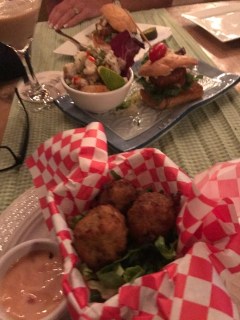 The West Deck was our next dinner stop and this was an informal spot overlooking the beach and we could watch the cruise ships go out. I love conch fritters and was looking forward to those as well as the Ceviche which was very good. Leslie’s fish sliders hit the spot.