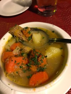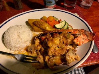 The most interesting choice of the week was the Old Cunucu House which is a local Aruban favorite. Of course, I could not resist ordering the Iguana soup which tasted like really good chicken with a kicker. My main meal was the caribbean lobster with cheese which I liked a lot. This local restaurant with two wonderful stray dogs hanging out was fun.